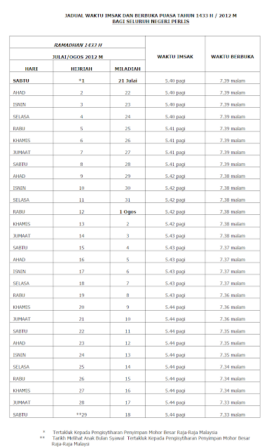 Sebagai rujukan diri sendiri dan rakan-rakan yang sudi menjenguk blog ni, di sini disertakan senarai waktu Imsak & Berbuka Puasa 2012/1433 Hijrah bagi kawasan rumah aku di Kuala Lumpur/ Putrajaya dan kawasan kampung halaman aku di Negeri Perlis.Â